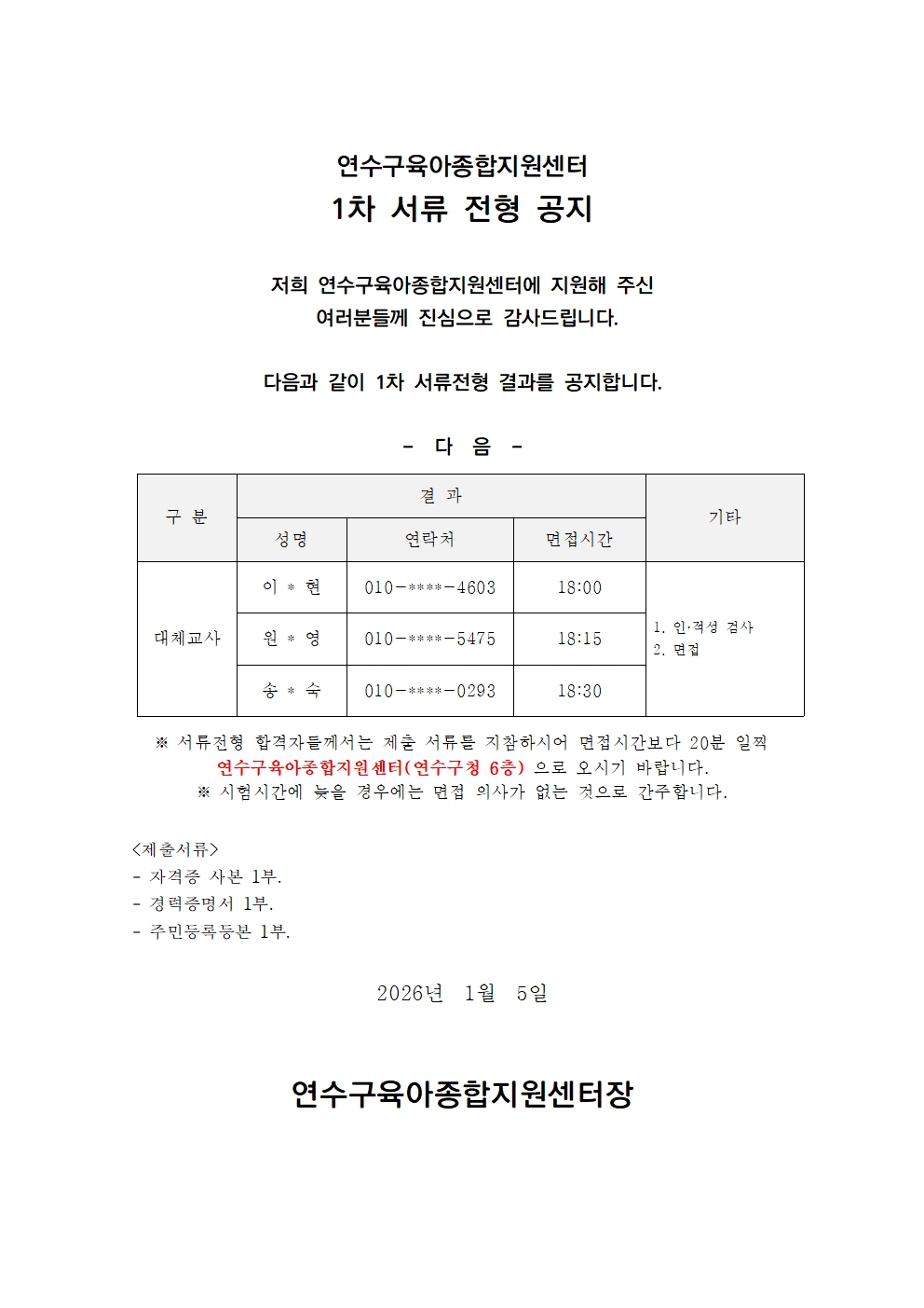 | [º»¼¾ÅÍ] 2026³âµµ ¿¬¼ö±¸À°¾ÆÁ¾ÇÕÁö¿ø¼¾ÅÍ ´ëü±³»ç ä¿ë 1Â÷ ÇÕ°ÝÀÚ °øÁö | |||||
