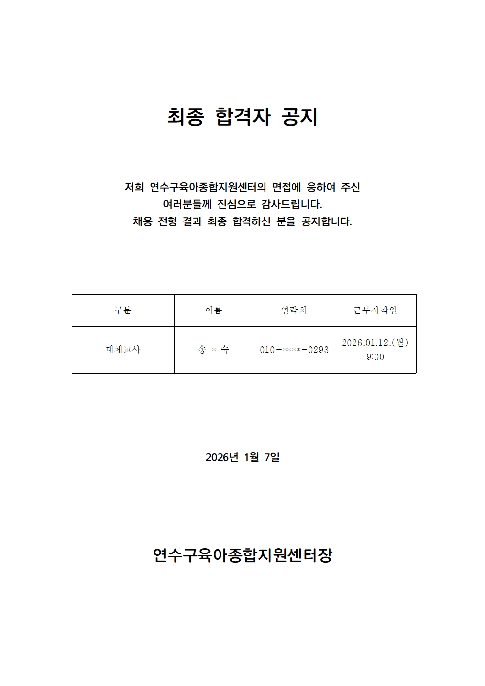 | [º»¼¾ÅÍ] 2026³âµµ ¿¬¼ö±¸À°¾ÆÁ¾ÇÕÁö¿ø¼¾ÅÍ ´ëü±³»ç ä¿ë ÃÖÁ¾ ÇÕ°ÝÀÚ °øÁö | |||||