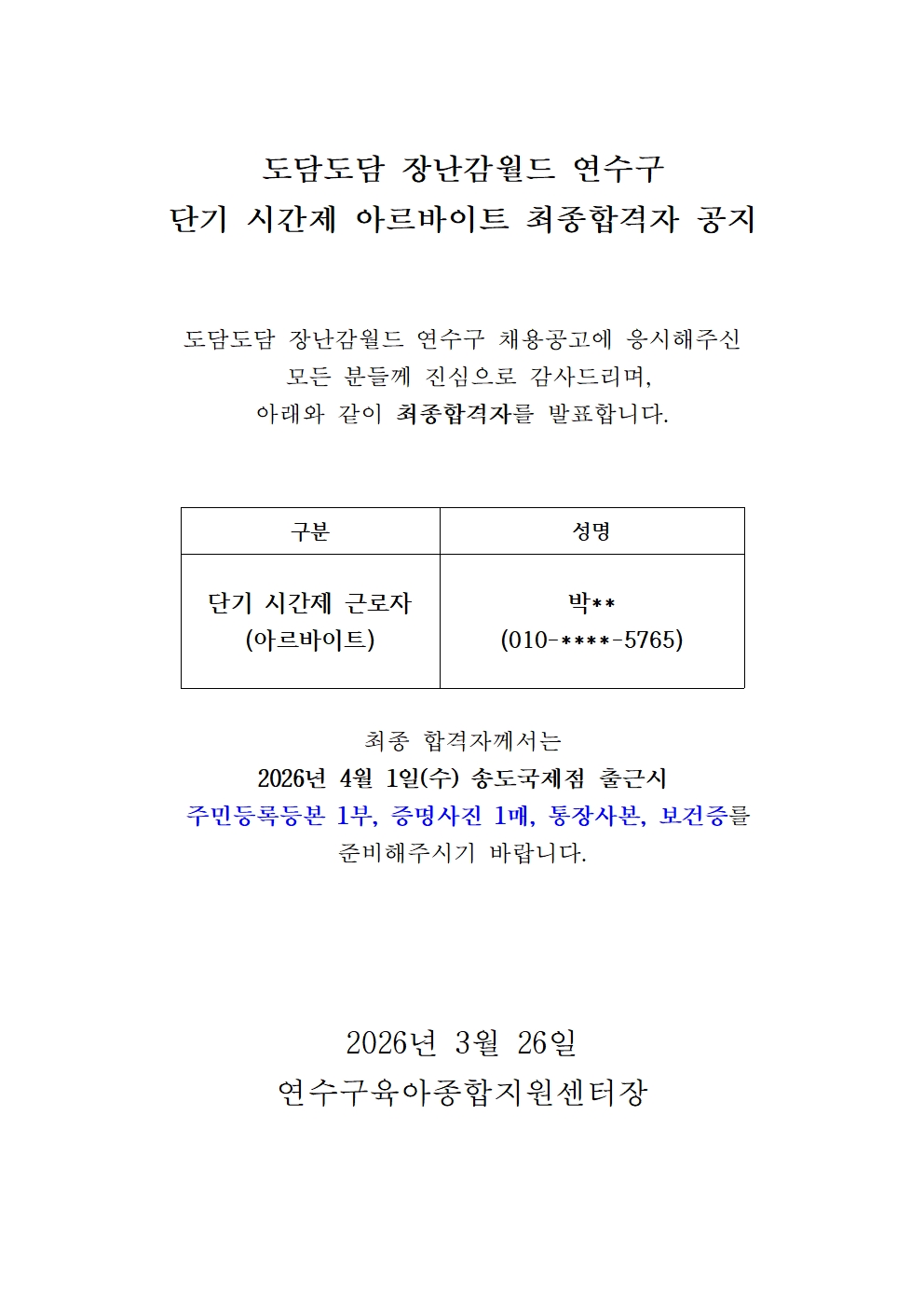 | ÀÌÀü±Û ¡ã | [º»¼¾ÅÍ] 2026³â ¿¬¼ö±¸À°¾ÆÁ¾ÇÕÁö¿ø¼¾ÅÍ ´ëü±³»ç ä¿ë ÃÖÁ¾ ÇÕ°ÝÀÚ °øÁö | ||||