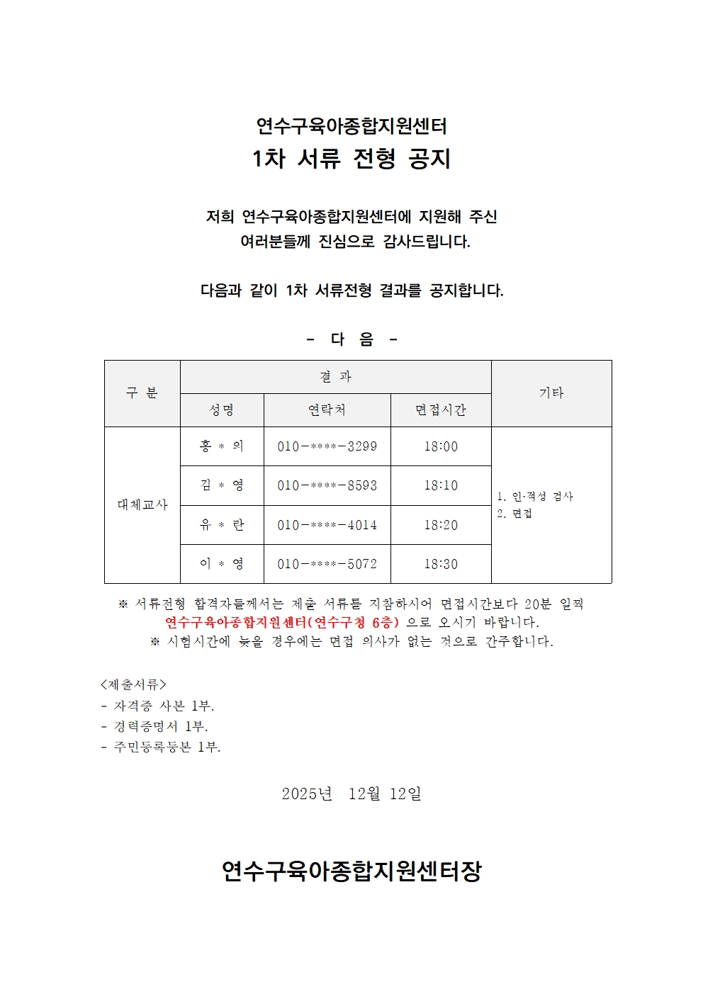 | [º»¼¾ÅÍ] 2026³âµµ ¿¬¼ö±¸À°¾ÆÁ¾ÇÕÁö¿ø¼¾ÅÍ ´ëü±³»ç ä¿ë 1Â÷ ÇÕ°ÝÀÚ °øÁö | |||||