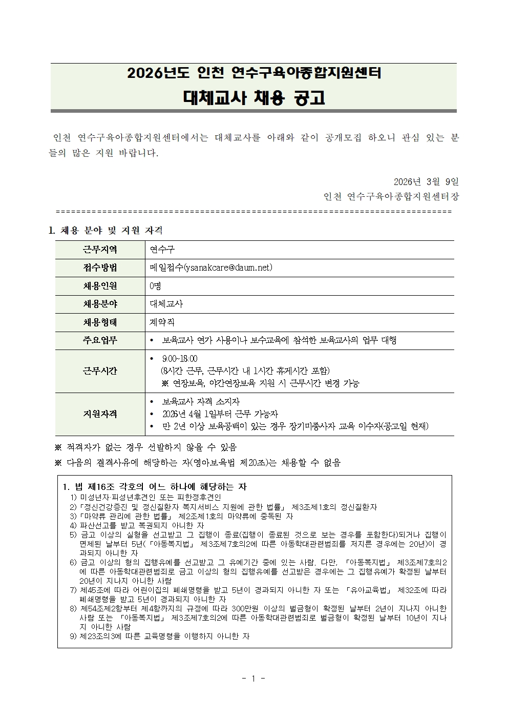 [º»¼¾ÅÍ] 2026³âµµ ¿¬¼ö±¸À°¾ÆÁ¾ÇÕÁö¿ø¼¾ÅÍ ´ëü±³»ç ä¿ë °ø°í
