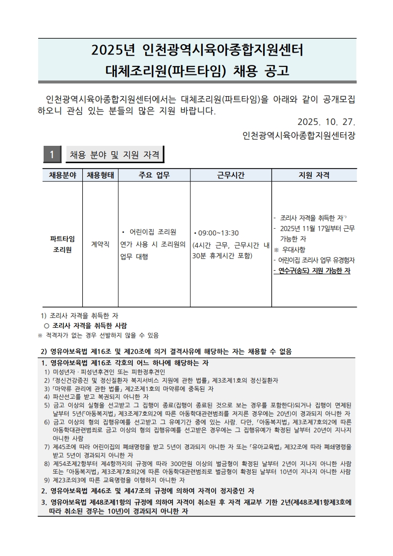 | [ÀÎõ½ÃÀ°¾ÆÁ¾ÇÕÁö¿ø¼¾ÅÍ] ´ëüÁ¶¸®¿ø(ÆÄƮŸÀÓ) ä¿ë °ø°í | |||||