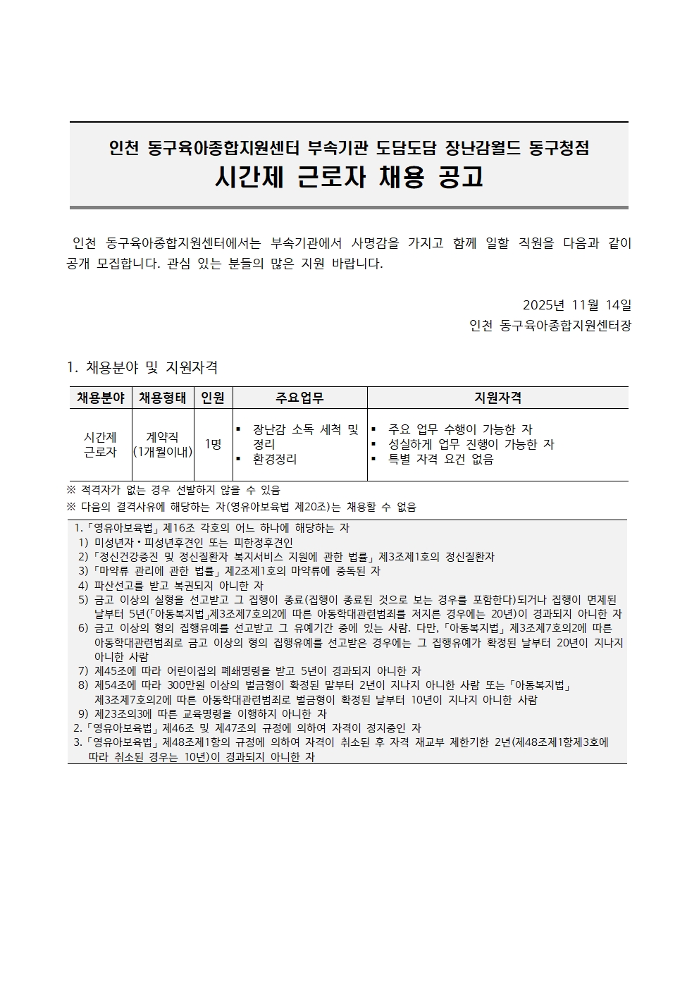 | [µ¿±¸À°¾ÆÁ¾ÇÕÁö¿ø¼¾ÅÍ] µµ´ãµµ´ãÀå³°¨¿ùµå ½Ã°£Á¦ ±Ù·ÎÀÚ Ã¤¿ë °ø°í | |||||