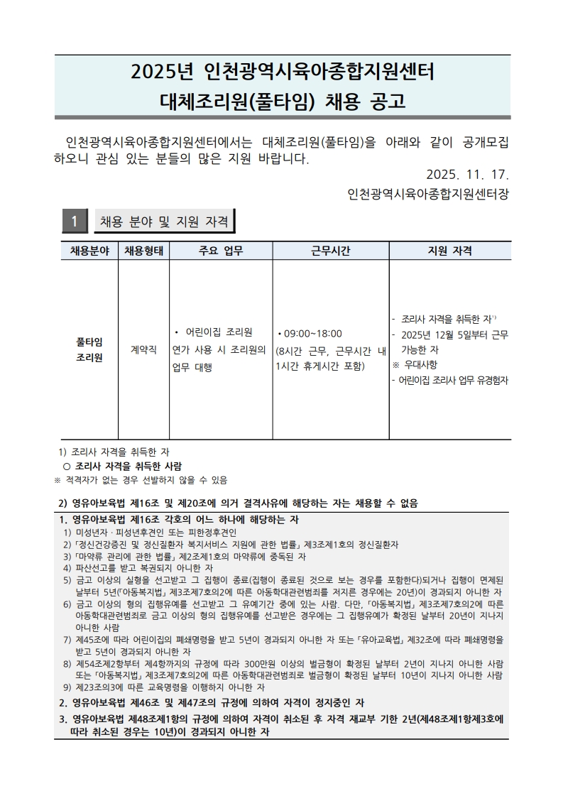 | [ÀÎõ½ÃÀ°¾ÆÁ¾ÇÕÁö¿ø¼¾ÅÍ] ´ëüÁ¶¸®¿ø(ǮŸÀÓ) ä¿ë °ø°í | |||||
