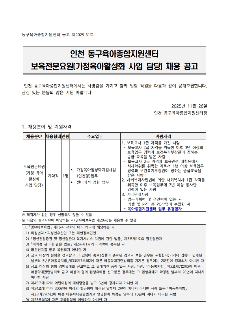| [µ¿±¸À°¾ÆÁ¾ÇÕÁö¿ø¼¾ÅÍ] º¸À°Àü¹®¿ä¿ø(°¡Á¤À°¾ÆÈ°¼ºÈ) ä¿ë °ø°í | |||||