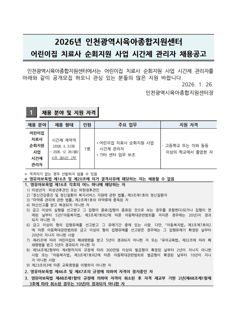 | [ÀÎõ½ÃÀ°¾ÆÁ¾ÇÕÁö¿ø¼¾ÅÍ] ¾î¸°ÀÌÁý Ä¡·á»ç ¼øÈ¸Áö¿ø »ç¾÷ ½Ã°£Á¦ °ü¸®ÀÚ Ã¤¿ë °ø°í | |||||