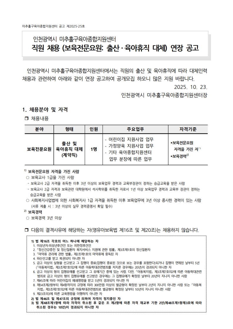 | [¹ÌÃßȦ±¸À°¾ÆÁ¾ÇÕÁö¿ø¼¾ÅÍ] º¸À°Àü¹®¿ä¿ø(À°¾ÆÈÞÁ÷ ´ëü) ä¿ë ¿¬Àå °ø°í | |||||